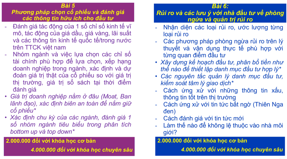 (2) Tiết 2: hướng dẫn các kỹ năng, thực hành ngay với các tình huống, các mã cổ phiếu, trái phiếu, chứng chỉ quỹ đang có trên thị trường.