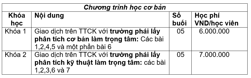 Ngoài ra, Công ty chúng tôi nhận các khóa học theo yêu cầu của học viên (ví dụ chỉ học chuyên sâu về phân tích kỹ thuật, phân tích và lập danh mục đầu tư trái phiếu...). Trường hợp này học phí sẽ được thông báo căn cứ vào số lượng học viên và yêu cầu nội dung khóa học.