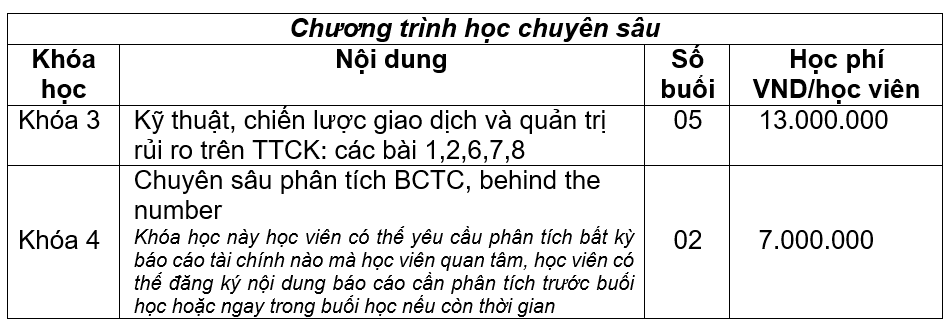 Riêng với lớp học chuyên sâu, giờ thực hành chuyên sâu sẽ dành để phân tích cùng chuyên gia, “behind the number”, “behind the wave” của chính các mã cổ phiếu mà học viên đang quan tâm. Thực hành với chuyên gia giúp cho học viên có thể tự chọn lọc các kênh thông tin, tự phân tích đánh giá giá trị và xu hướng, xác định phong cách đầu tư phù hợp với túi tiền và mức độ chấp nhận rủi ro của bản thân, chủ động nhận diện sai lầm và tự rút ra các bài học kinh nghiệm...