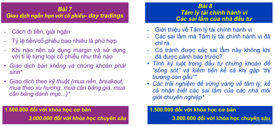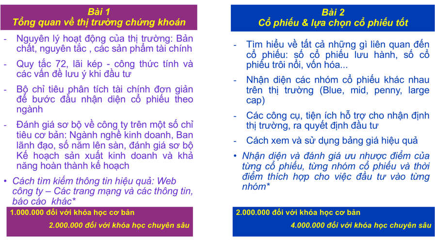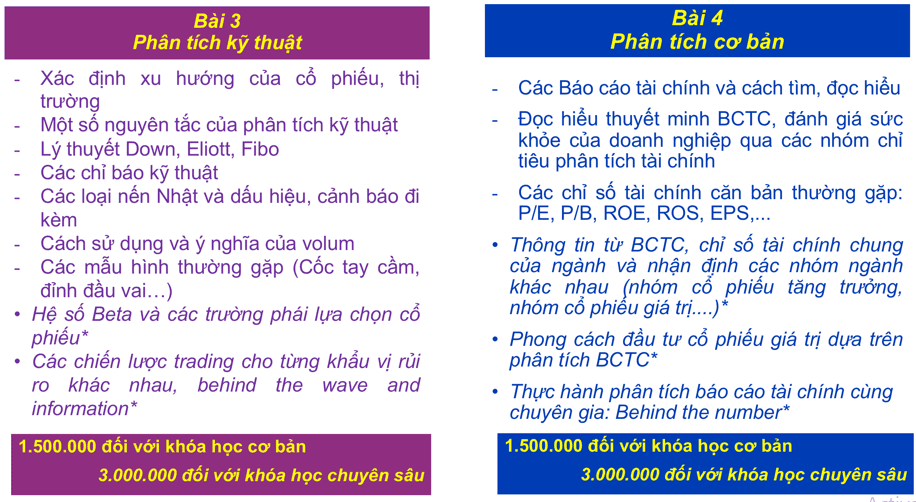 (2) Tiết 2: hướng dẫn các kỹ năng, thực hành ngay với các tình huống, các mã cổ phiếu, trái phiếu, chứng chỉ quỹ đang có trên thị trường.